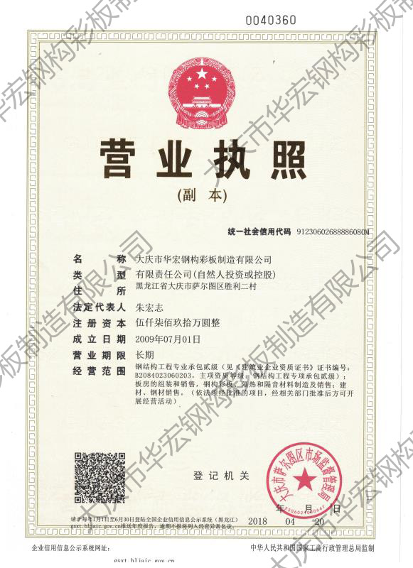 華宏鋼構(gòu)始建于2009年8月9日,總部位于大慶市薩爾圖區(qū)南一路13號(hào),現(xiàn)有大慶市華宏鋼構(gòu)彩板制造有限公司、黑龍江省華宏力安綠建科技有限公司、大慶市華宏鋼構(gòu)彩板制造有限公司長(zhǎng)春分公司、黑龍江省海森新材料科技有限公司、大慶市瑞和通螺栓廠五家工業(yè)企業(yè)形成了以彩板復(fù)合板、裝配式鋼結(jié)構(gòu)建筑、保溫材料、配件制造為主的五大生產(chǎn)基地,占地總面積 20余萬(wàn)平方米,生產(chǎn)車(chē)間5萬(wàn)平方米。中高層管理干部26 人,高級(jí)工程師9人,各類國(guó)家注冊(cè)執(zhí)業(yè)人員 32 人,車(chē)間技工 260人,專業(yè)安裝隊(duì)伍 10 余支,帶動(dòng)就業(yè) 500